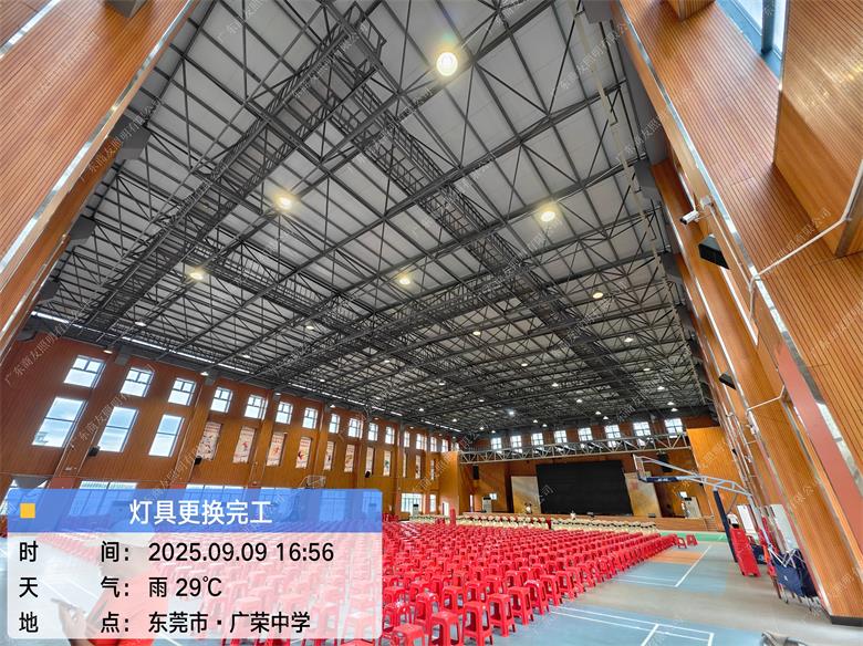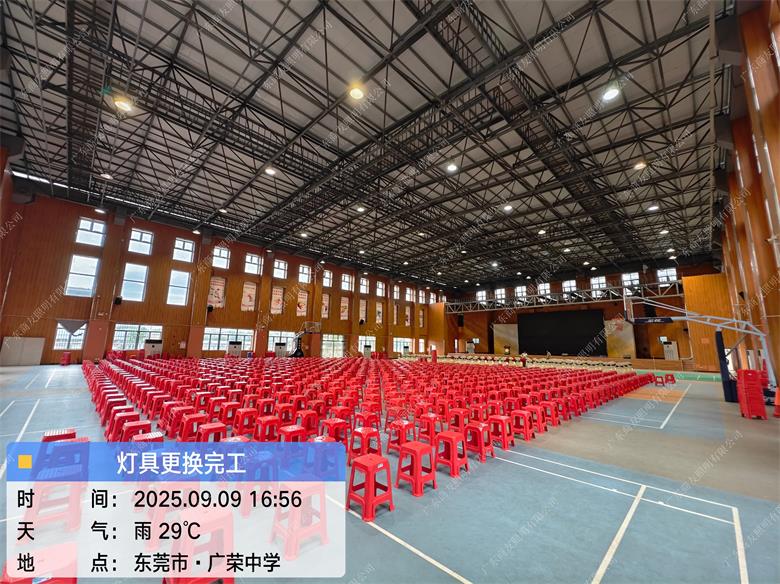项目简述;?2025年9月,买球(中国)以专业高效的施工标准,为东莞沙田实验中学球馆提供LED工矿灯、球场灯及全流程安装维保服务,通过模块化施工与精准光效调试,确保灯具系统在活动启动前全面投用,为校园活动提供专业照明保障,助力活动圆满举办。